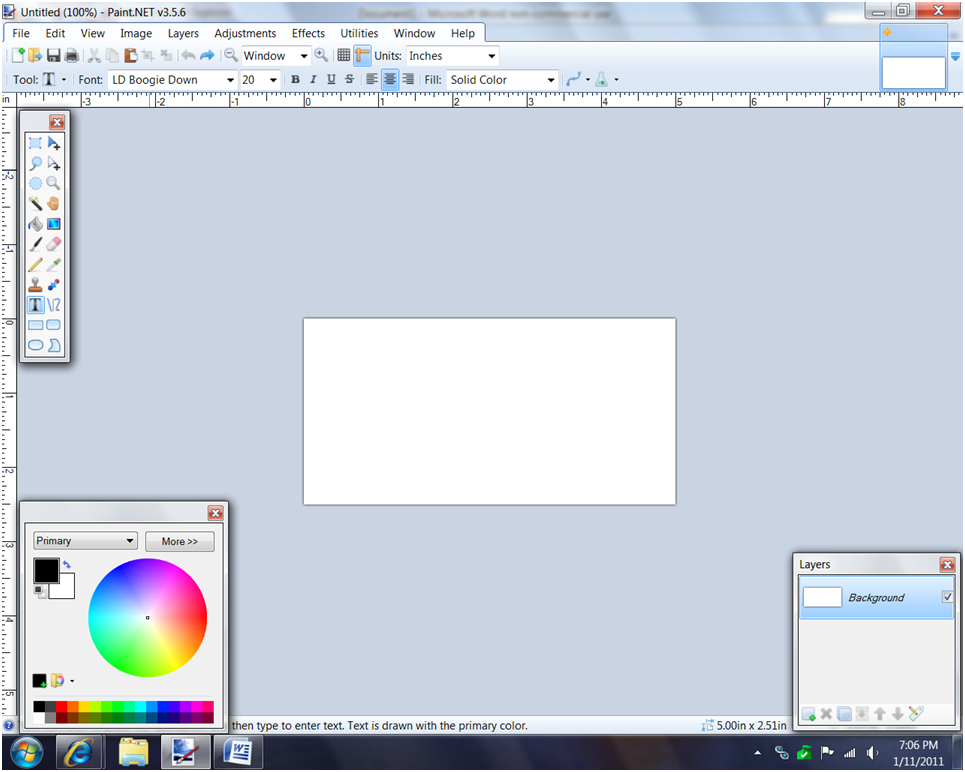1. Open Paint.net. Be sure that the Tools window and Layers window are open. Here I have the Tools window open in the upper left hand corner and the Layers window in the lower right hand corner. The Colors window is open in the lower left hand corner, but is not needed for this application.